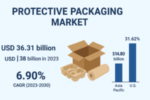 The global protective packaging market size was valued at USD 36.31 billion in 2022 and is projected to grow from USD 38.52 billion in 2023 to USD 61.44 billion by 2030, exhibiting a CAGR of 6.90% during the forecast period. Asia Pacific dominated the protective packaging market with a market share of 31.62% in 2022. Moreover, the protective packaging market in the U.S. is projected to grow significantly, reaching an estimated value of USD 14.80 billion by 2032, driven by the increasing use of protective packaging products in international trade.